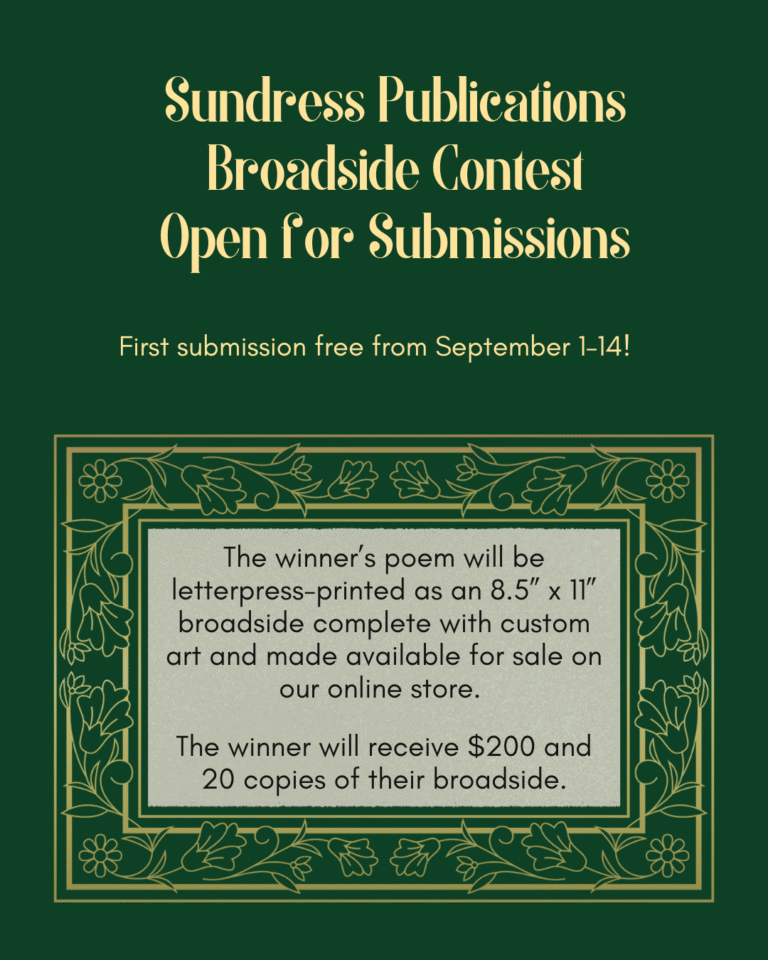 Sundress Publications is pleased to announce that we are now open for submissions for our annual poetry broadside contest. The contest will be open for submission between September 1st to