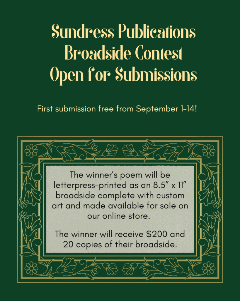 Sundress Publications is pleased to announce that we are now open for submissions for our annual poetry broadside contest. The contest will be open for submission between September 1st to November 30th, 2025.